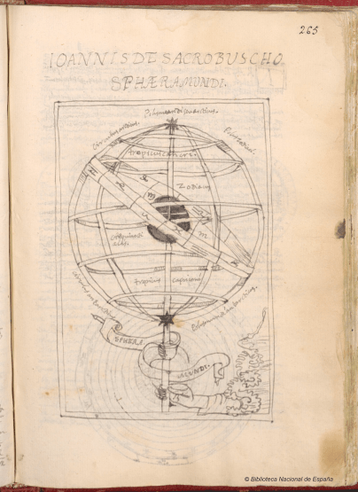 Johannes de Sacro Bosco, ca 1195-ca 1256. Obra dividida en cuatro partes. La primera trata las propiedades de la esfera, identificando su centro, sus secciones y polos y describe cuantas esferas son necesarias para describir el universo, se menciona de igual modo la ascendencia y descendencia de los signos del zodiaco, la división de la tierra de acuerdo al clima; la última parte trata del movimiento de los planetas y se describe el fenómeno de los eclipses.