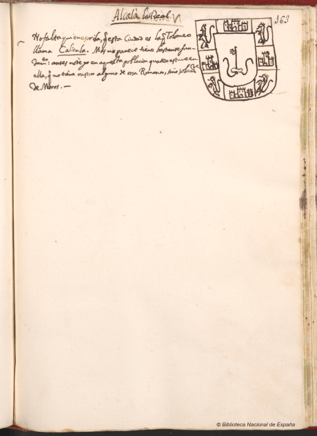 En la página 163 Martín Ximena Jurado habla del pasado de Alcalá la Real. Y con el dibujo del escudo de la cuidad, nos dice: No falta quien escriba questa ciudad es la que Tolomeo llama Calicula. Más no parece que tiene bastante fundamento. Antes este yo en aquesta población, quando estuve en ella que no tiene rastro alguno de cosa Romana, si no solamente de moros.