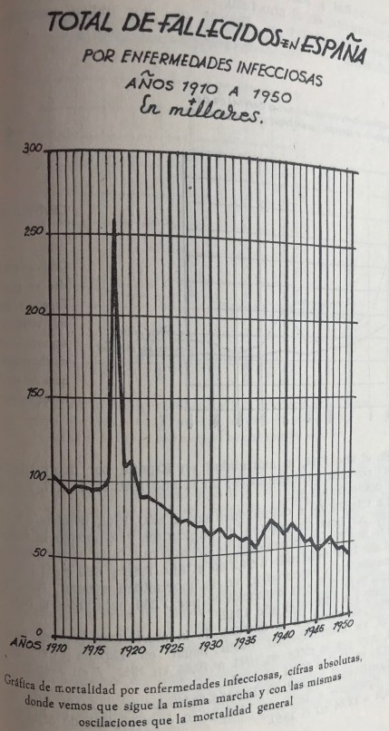 Muchas fiestas patronales, ayudaron también a expandir violentamente la enfermedad por la movilización de los aldeanos de unos pueblos a otros. Una vez establecida la epidemia de gripe y dada su extrema contagiosidad y rapidez de difusión, no se esperan radicales efectos de las medidas sanitarias adoptadas por los Poderes Públicos. El aislamiento colectivo de enfermos es incapaz contra los casos latentes o simplemente sospechosos y contra los que padecen tuberculosis abierta. La desinfección simultanea de los infinitos focos y lugares es completamente atópica. Por estas razones, la única defensa salvadora es la profilaxis individual. Todas las reglas de profilaxis personal contra la gripe pueden resumirse en estas dos proposiciones: