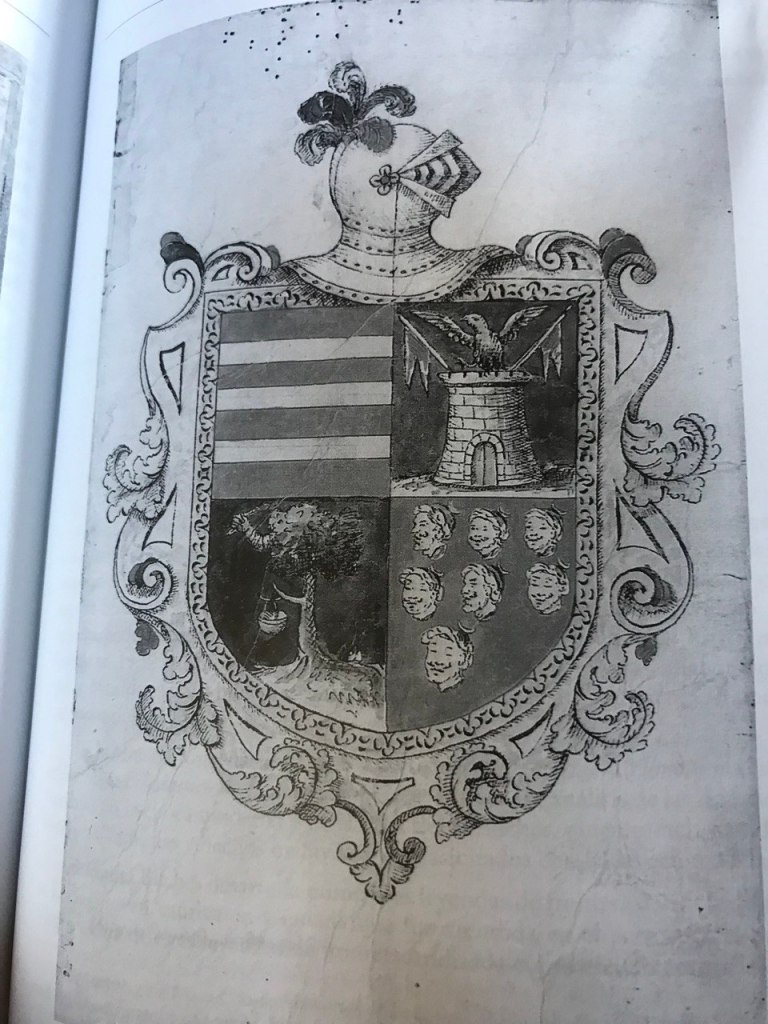 En el segundo de los folios se nos presenta el escudo de los Arjona. Se trata de un pavés cuartelado, en el primero de ellos, barras horizontales en rojo y amarillo. En el primer cuartel de la derecha, se reproduce una atalaya con un águila y dos banderas. Son en los dos cuarteles inferiores, en dónde se nos representan otras dos de las leyendas que hicieron de Juan de Arjona, un guerrero sin par. A la derecha siete cabezas de moros, en clara referencia a la leyenda antes mencionada. A la izquierda una encina, de la que sale un brazo con una antorcha encendida, y un cesto, en referencia a la leyenda siguiente: